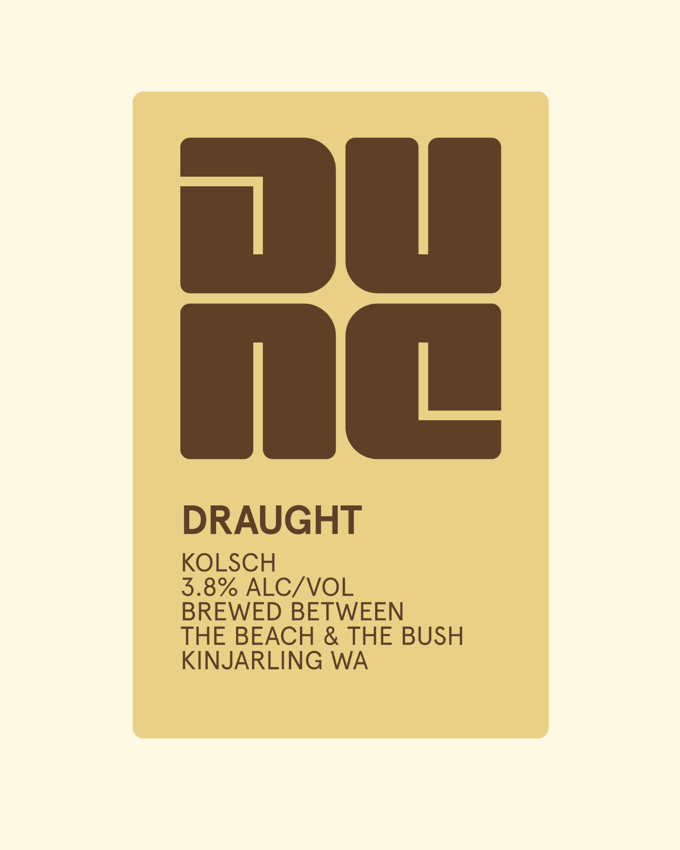 A Golden Gem of the South, our draught is brewed in a familiar style. It uses only locally grown Hallertau & Cluster hops from our friends at Great Southern Hops. Pair its scent of sweet bread, earth, Goji and petrichor, and its moderately bitter & acidic fruit finish with local oysters or seafood and a cool breeze on a hot day. It's a timeless, no-fuss beer with good intentions.